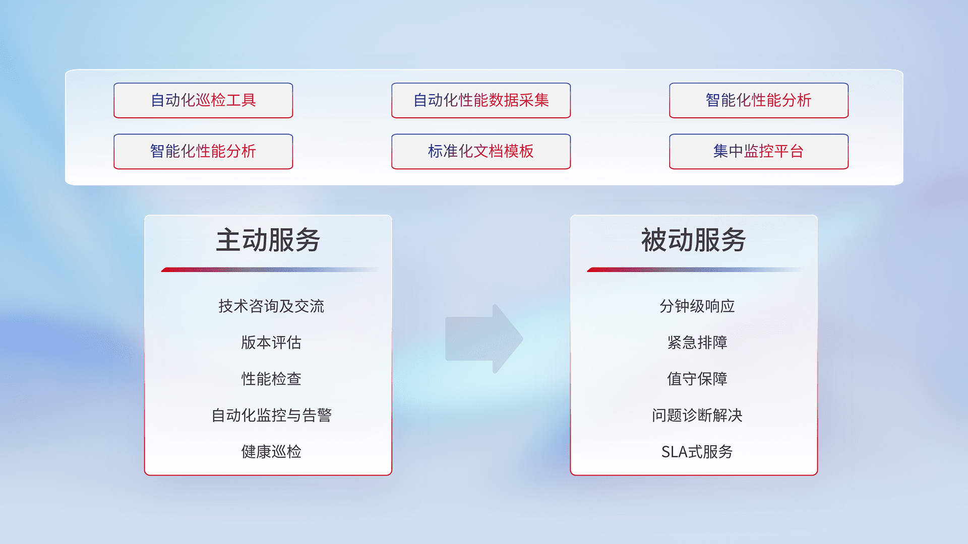 智能化工具和标准化文档,,,,保障服务质量,,提供主动服务(包含技术咨询、、、、版本评估、、、性能检查、、、自动化监控与告警、、、健康巡检)和被动服务包含(分钟级响应、、、紧急排障、、值守保障、、、、问题诊断解决、、、、SLA服务)。。。。