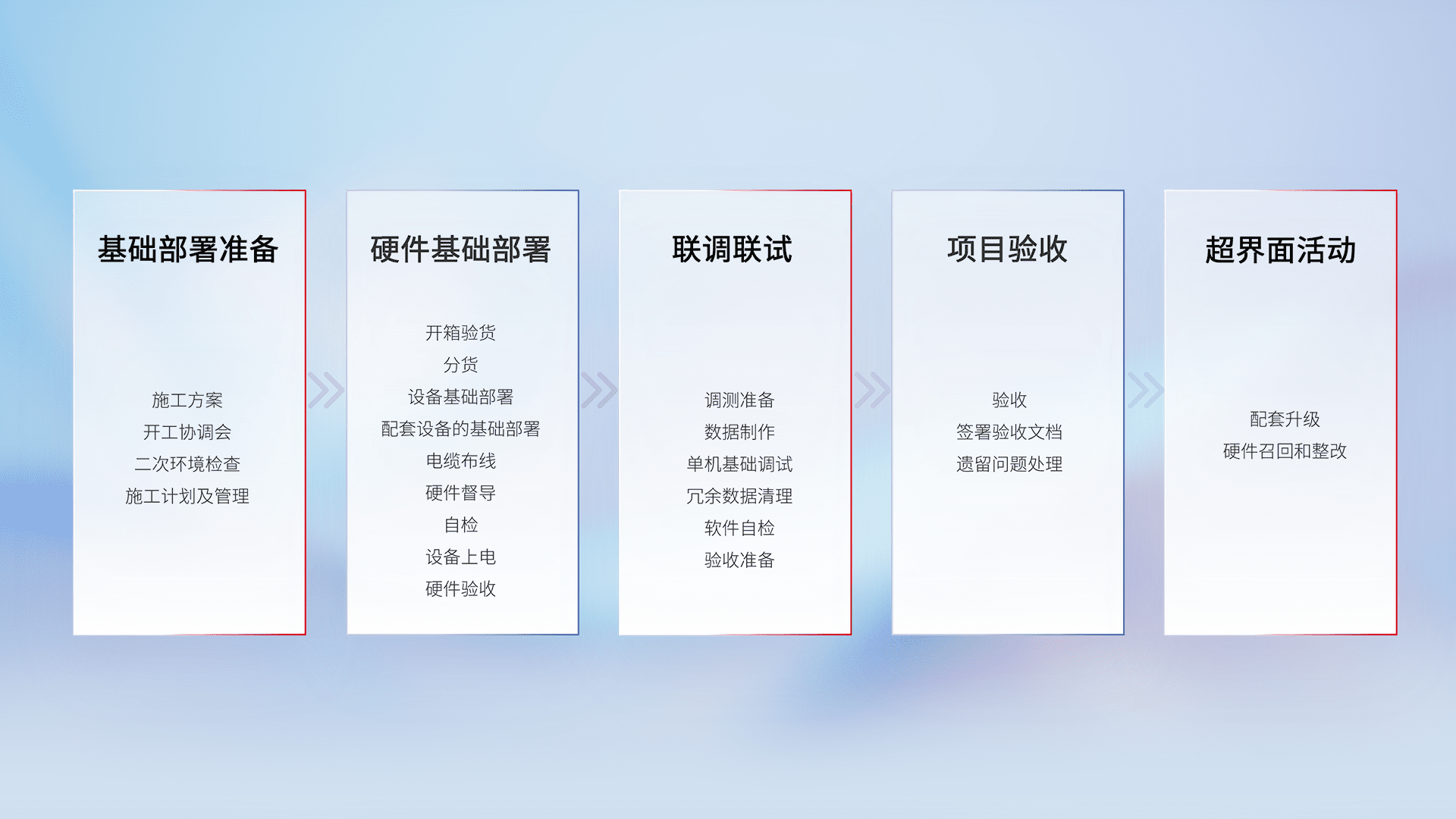 从基础部署准备、、、硬件基础部署、、、联调联试、、项目验收、、、越界面活动的全过程可追溯,,保证施工质量和进度。。。。
